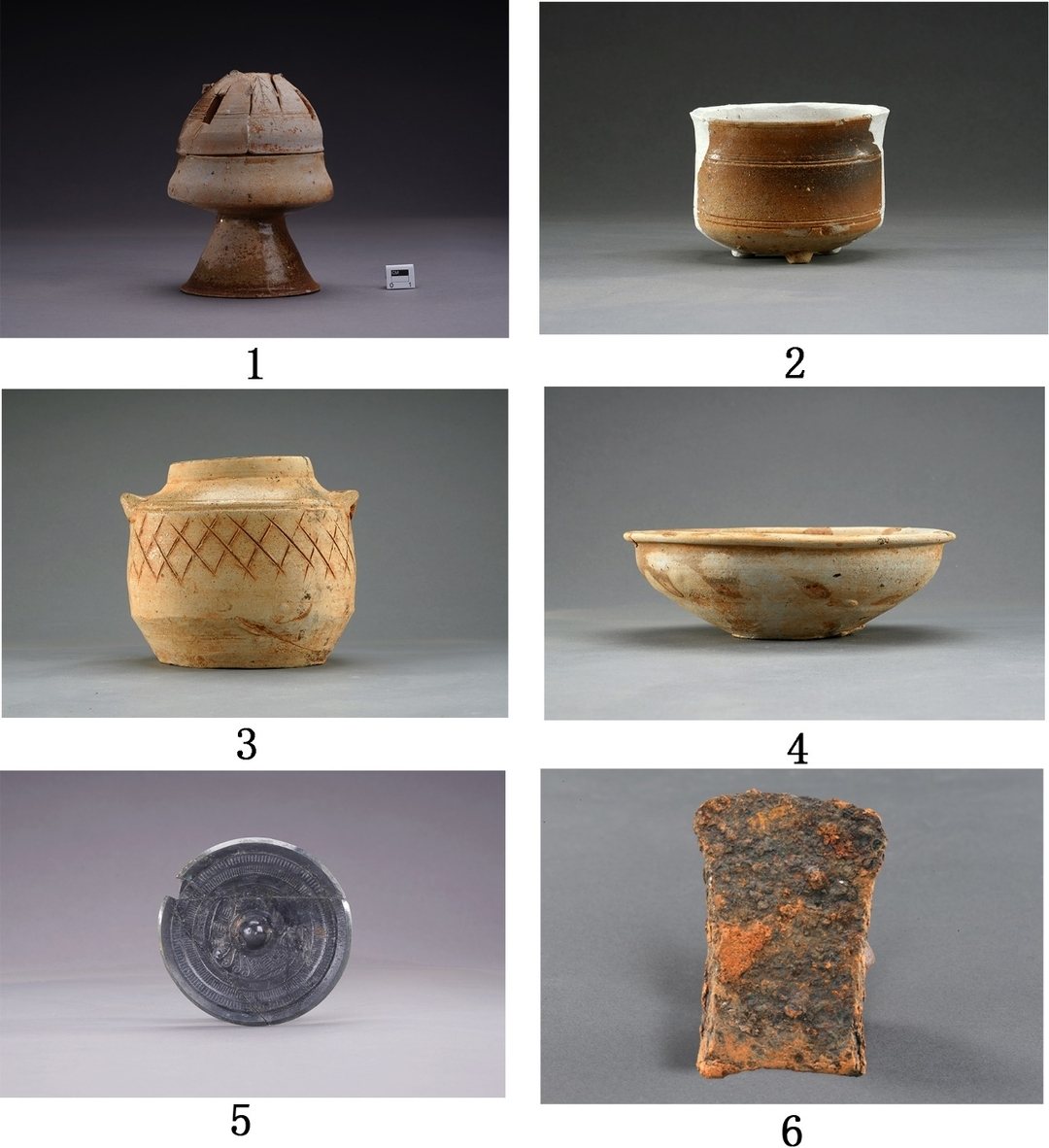 1.熏炉(白石M1:16)2.杯(白石M1:18)3.双系罐(白石M2:18)4.盆(白石M2:10)5.铜镜(白石M2:11)6.铁釜(白石M1:24)