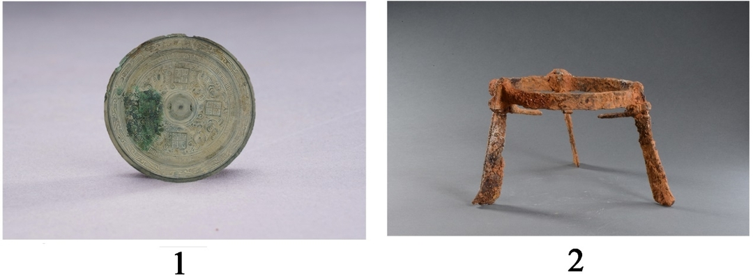 1.铜镜(寺冲M1:25) 2.铁三足釜架(寺冲M1:20)