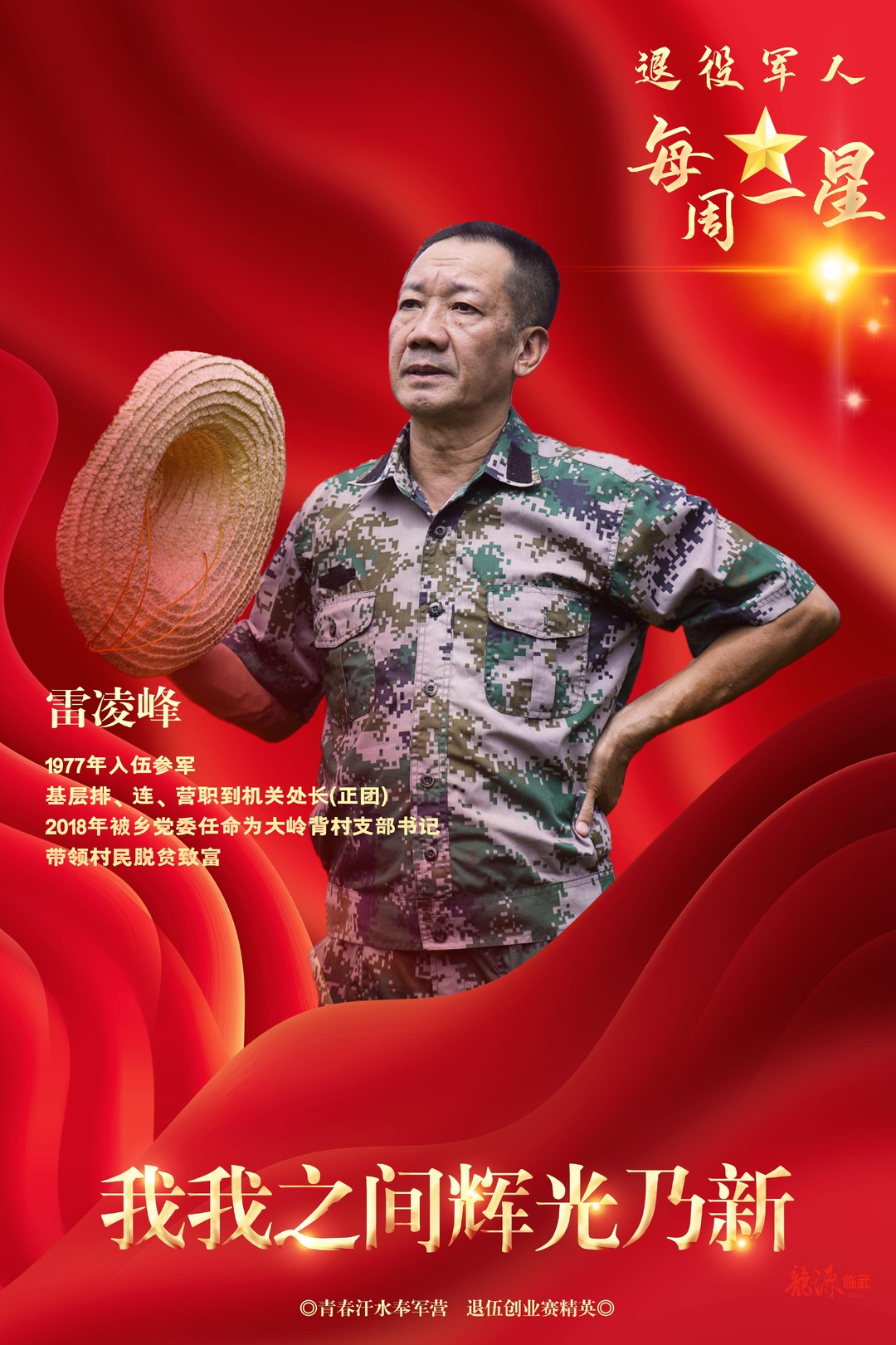 从乡村走进军营,再由军营回归乡村,曾经的团长,现在的村支书……自2018年6月担任临武县西瑶乡大岭背村支部书记以来,拥有45年党龄的老党员雷凌峰,甘为故土守春秋,带领父老乡亲挪穷窝、拔穷根、摘穷帽,为改变家乡穷困战天斗地,在角色转换间升华生命,将军人形象演绎得饱满而鲜明,辉光乃新。