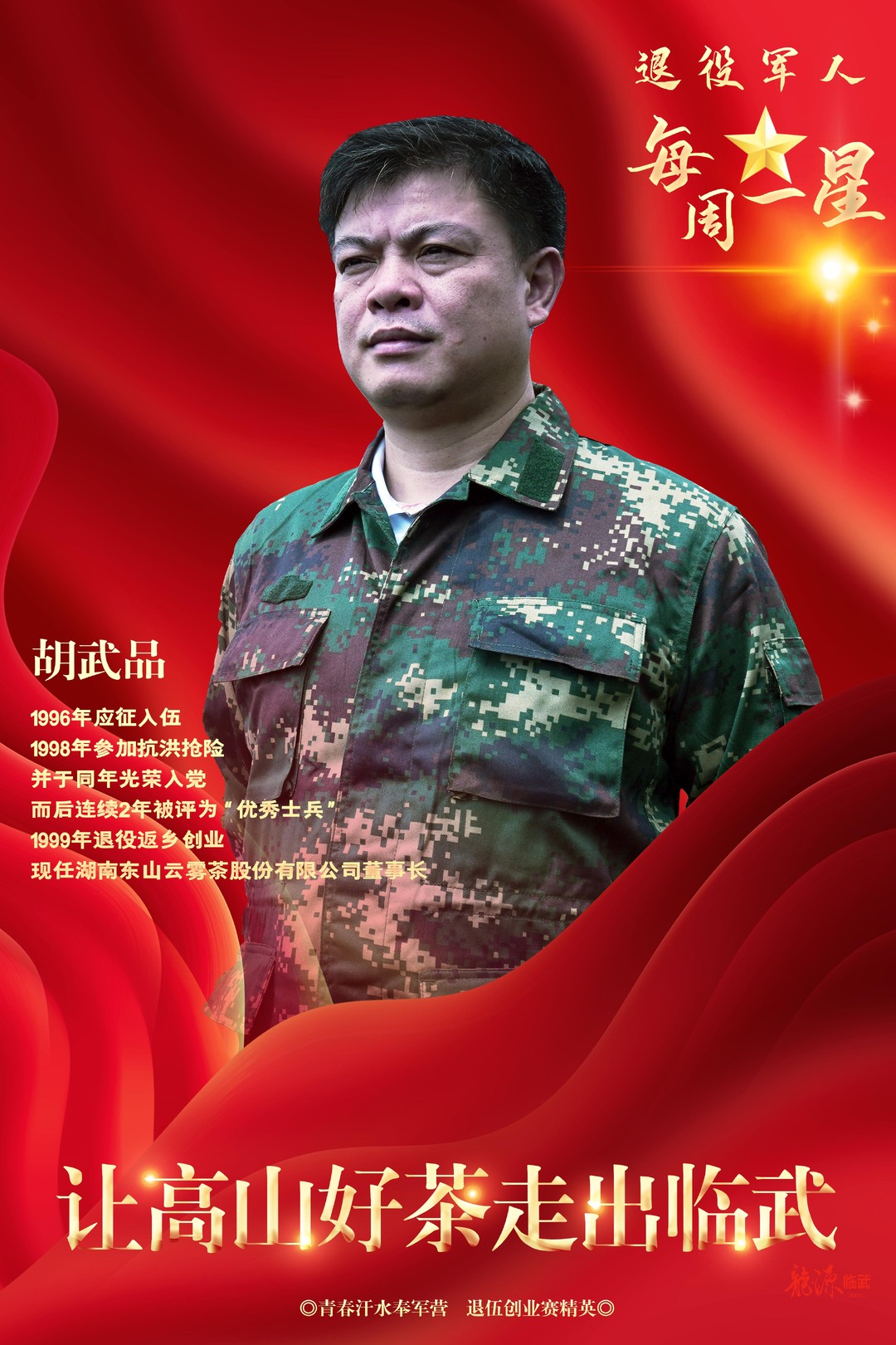 宝刀不老初心在,老兵精神耀潇湘。近年来,临武县一大批退役军人情系桑梓回报家乡,退伍不褪色阔步春风里,补钙铸魂风骨硬起来,擦亮党徽形象树起来,衣锦荣归事业做起来,一张张面孔、一颗颗初心、一串串足迹、一个个故事、一曲曲英雄赞歌……诠释大忠大义与大爱。走!让我们跟随他们的脚步,倾听大地的炽热,触摸底色的厚重,感受军人的家国情怀,汲取不竭力量,焕发精气神,奋力“闯创干”。“八一”期间,特推出“退役军人·每周一星”系列报道。今天,让我们一起来认识以茶兴业、以茶富民、以茶强县的退役军人:胡武品。