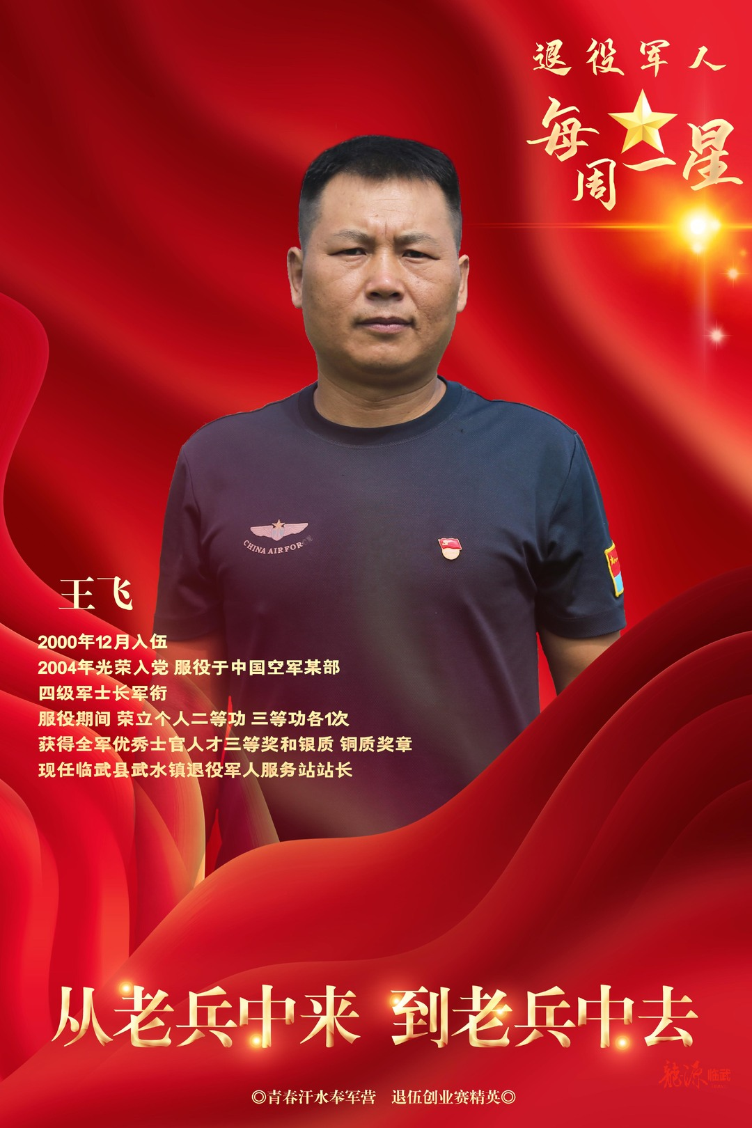 宝刀不老初心在,老兵精神耀潇湘。近年来,临武县一大批退役军人情系桑梓回报家乡,退伍不褪色阔步春风里,补钙铸魂风骨硬起来,擦亮党徽形象树起来,衣锦荣归事业做起来,一张张面孔、一颗颗初心、一串串足迹、一个个故事、一曲曲英雄赞歌……诠释大忠大义与大爱。走!让我们跟随他们的脚步,倾听大地的炽热,触摸底色的厚重,感受军人的家国情怀,汲取不竭力量,焕发精气神,奋力“闯创干”。“八一”期间,特推出“退役军人·每周一星”系列报道。今天,让我们一起来认识常怀为兵服务赤子心的退役军人:王飞。