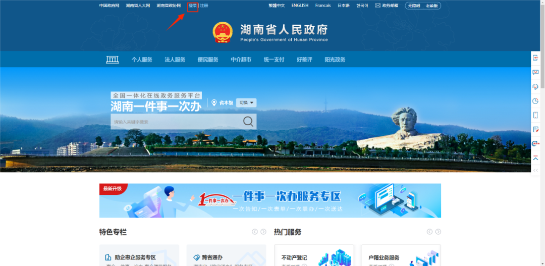 ①登录全国一体化在线政务服务平台湖南一件事一次办网站首页http://zwfw-new.hunan.gov.cn/hnzwfw/1/index.htm,点击左上角的登录;