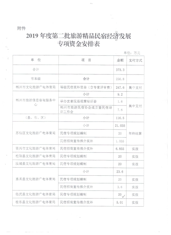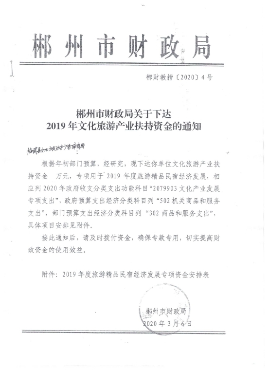 郴财教指【2020】4号 郴州市财政局关于下达2019文化旅游产业扶持资金的通知