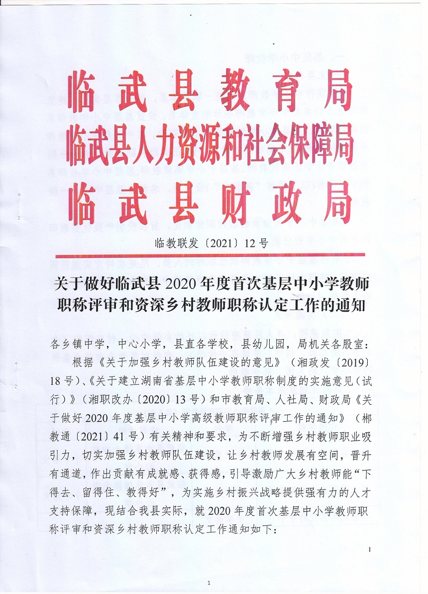 《关于做好临武县2020年度首次基层中小学教师职称评审和资深乡村教师职称认定工作的通知》