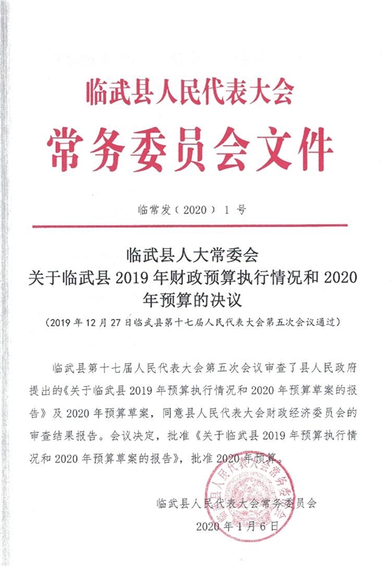 6. 临武县人大常委会关于临武县2019年财政预算执行情况和2020年财政预算的决议(临常发1号)