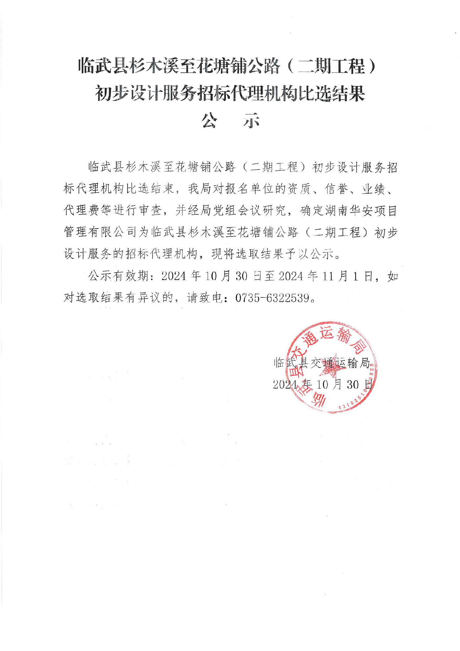 临武县杉木溪至花塘铺公路(二期工程)初步设计服务招标代理机构比选结果公示