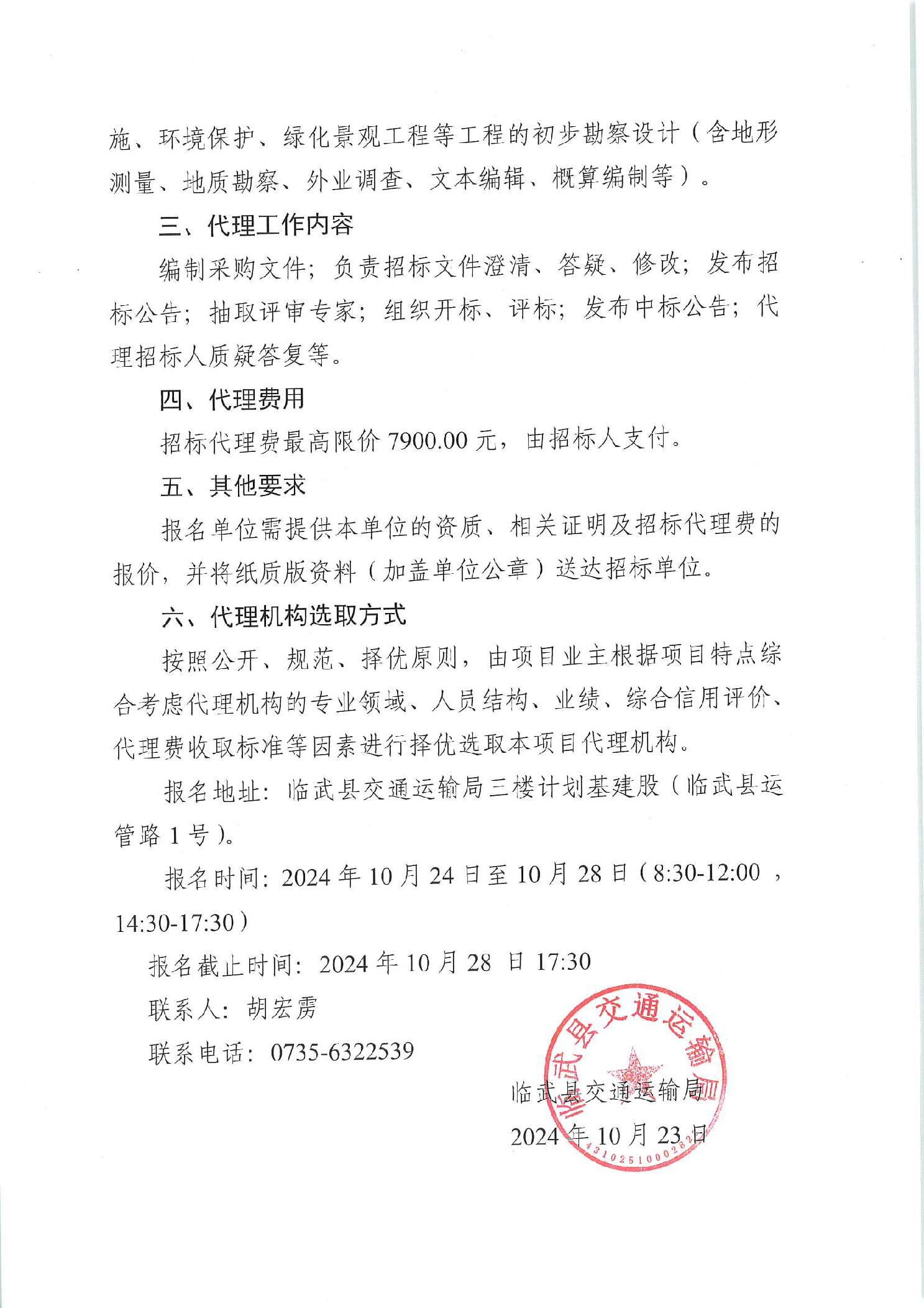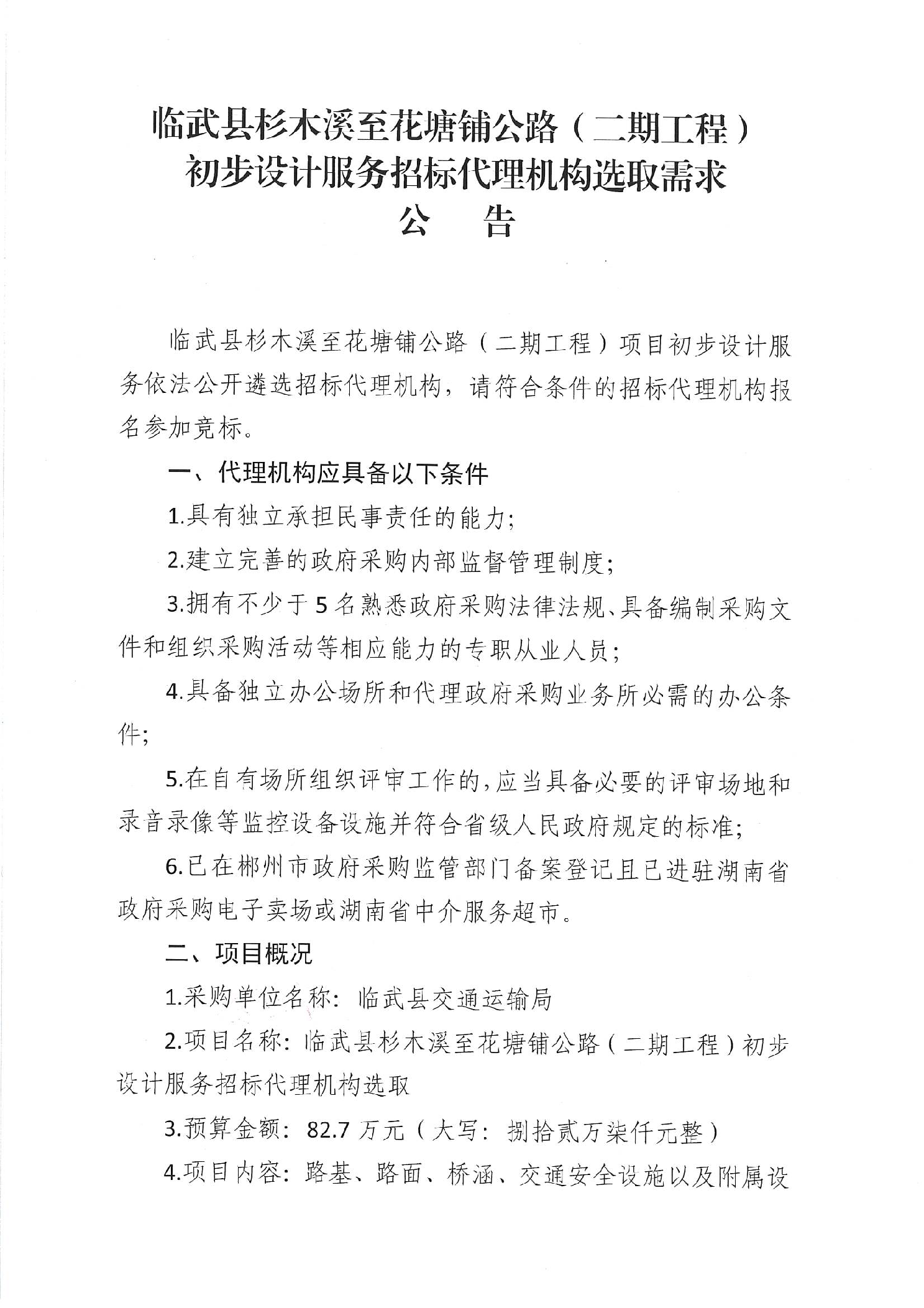 临武县杉木溪至花塘铺公路(二期工程)初步设计服务招标代理机构选取需求公告