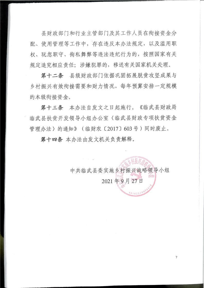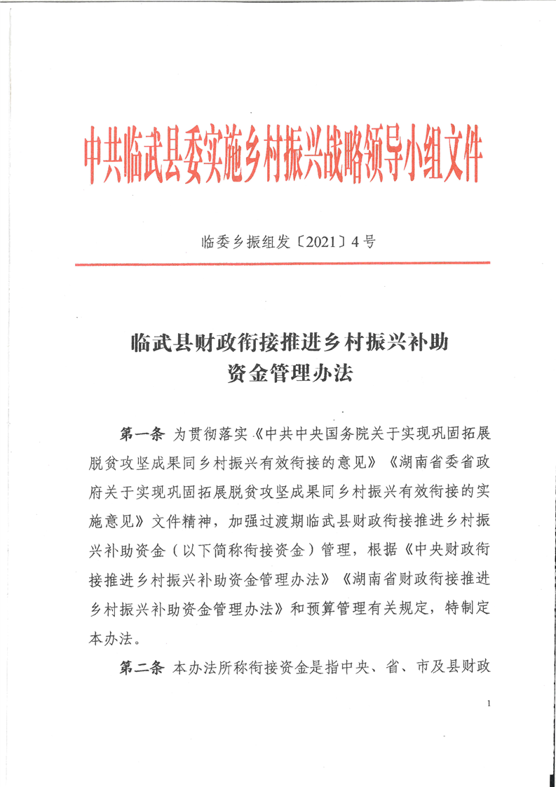 临武县财政衔接推进乡村振兴补助资金管理办法(临委乡振组发【2021】4号)