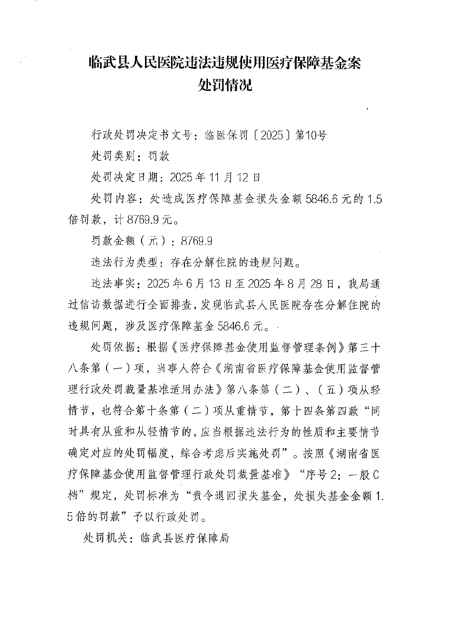 临武县人民医院违法违规使用医疗保障基金案处罚情况〔2025〕第 10号
